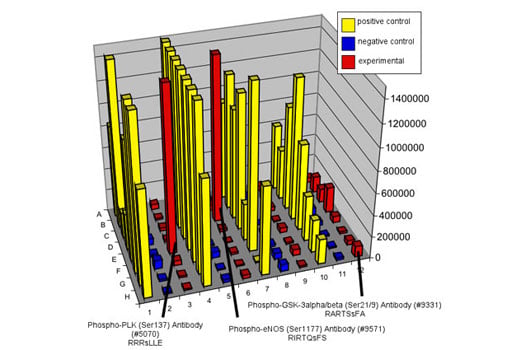With a total of 87 different peptide/phospho-specific antibody pairs on the array, a very diverse group of substrates is represented. Signal-to-noise ratios have been optimized and range from 10 to over 1000. The phospho-specific antibody and peptide substrate pair can be used for subsequent high throughput peptide based kinase screens (e.g., FP, TRF, AlphaScreen).