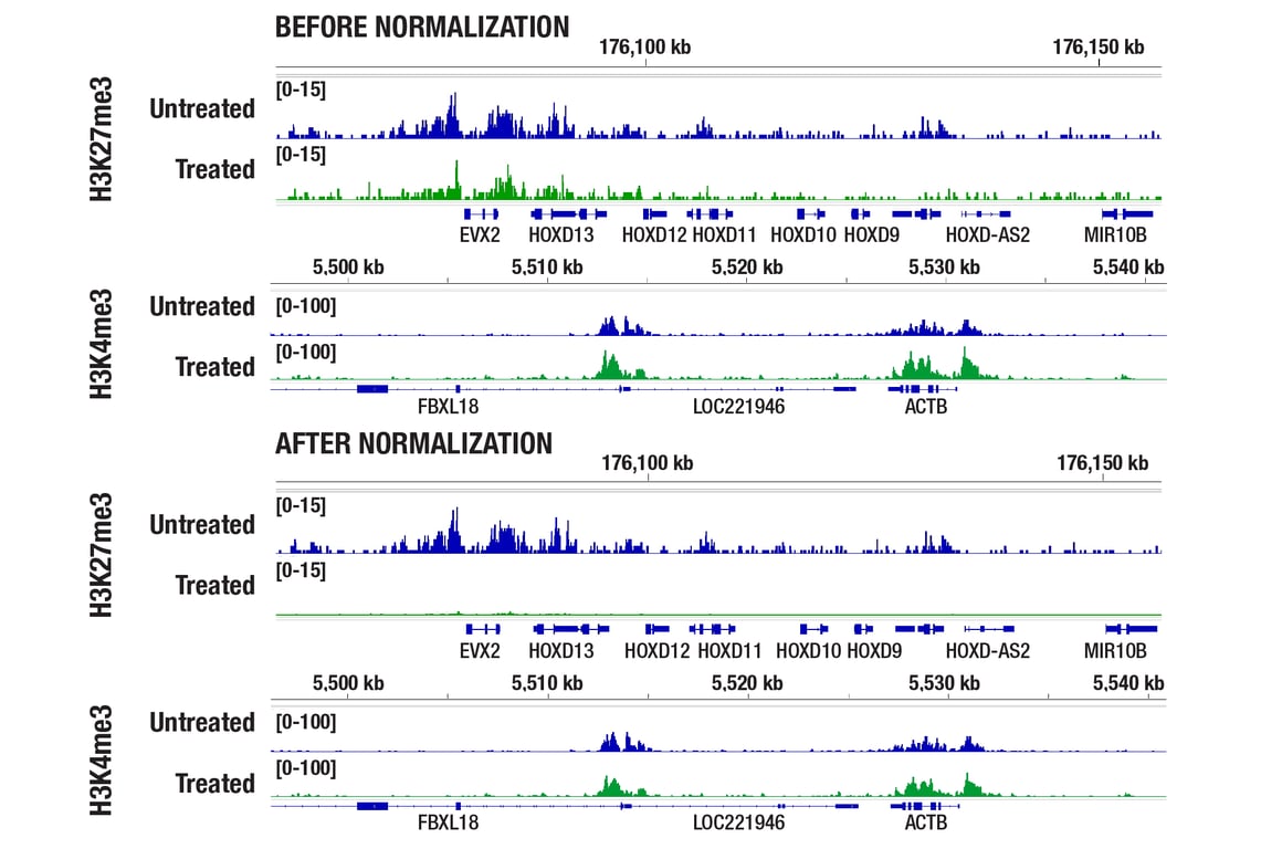 This kit includes a complete sample normalization strategy that starts with the addition of cryopreserved Drosophila spike-in nuclei to cell samples prior to performing the CUT&RUN assay. Like the cells of interest, the spike-in nuclei also bind to the Concanavalin A beads, providing a method to immobilize the spike-in nuclei for subsequent washes and incubations. During the antibody incubation step, a Drosophila H2Av antibody is added to the reaction in addition to the antibody against the target of interest. This Drosophila H2Av antibody provides a reliable method to target, digest, and enrich histone H2Av-bound Drosophila chromatin in a consistent way across all samples. This enrichment of H2Av-bound Drosophila chromatin occurs in the same tube as the enrichment of the target of interest from the test cell chromatin, ensuring that the spike-in control nuclei are subjected to all of the same steps and conditions as the test cells. A normalization factor is generated based on the Drosophila chromatin enrichment signal and is applied to the test genome to normalize signals across samples (see Figures 1 and 2). Thus, this spike-in normalization approach enables reliable and consistent normalization across samples, correcting for variations in starting cell number, technical variation among samples during processing, global histone modification changes, and non-specific enrichment coming from isotype control antibodies (i.e., non-specific rabbit IgG).
