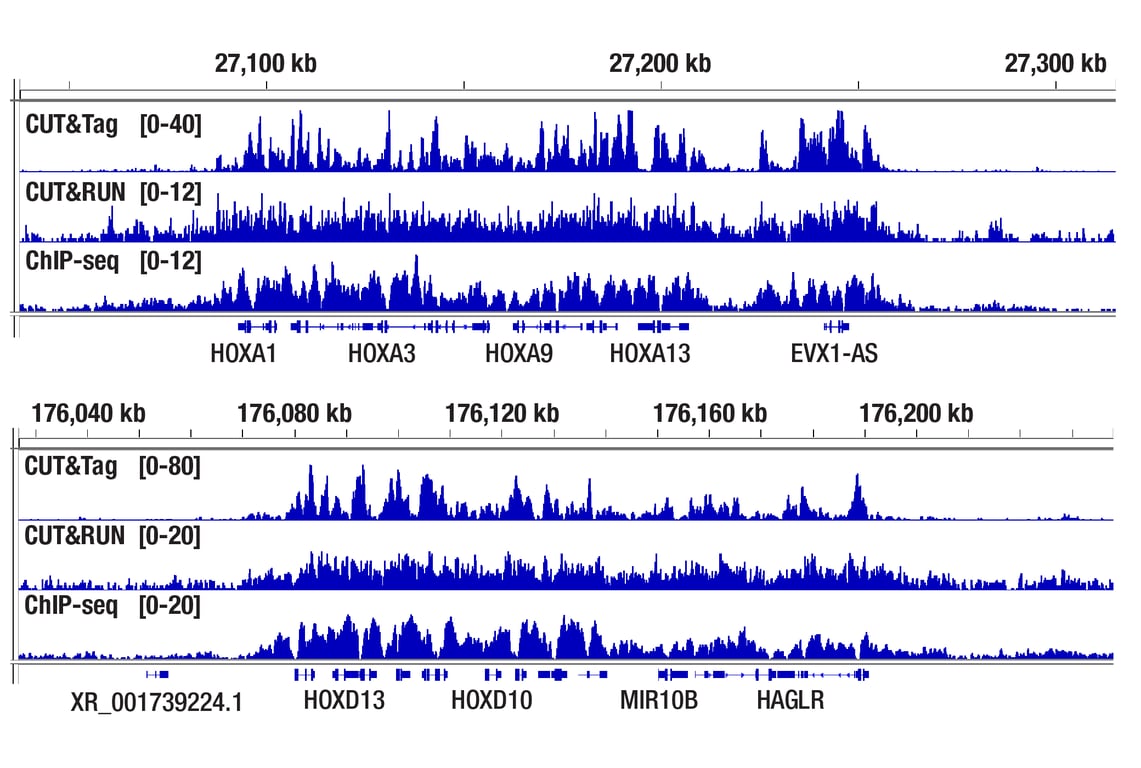 The CUT&Tag Assay Kit is designed to conveniently provide reagents needed to perform up to 24 reactions. The kit has been optimized to work in fresh or lightly fixed cells for all types of DNA-binding proteins, including histones, transcription factors, and cofactors. In addition, the kit has been optimized to work for histones in fresh or lightly fixed tissues. For analysis of transcription factors and cofactors in tissues, we recommend using the CUT&RUN Assay Kit #86652. If possible, we recommend using 100,000 cells or 1 mg of tissue per CUT&Tag reaction. If starting cell number is limited, this kit is validated to work with as few as 5,000 to 10,000 cells per reaction for histone modification targets and as few as 20,000 cells per reaction for transcription factors and cofactors. This kit is compatible with both whole cells and nuclei as starting material. We have not found that using nuclei generates a stronger signal or a higher signal-to-noise reaction compared to whole cells. A complete assay can be performed in as little as one day. The CUT&Tag Assay Kit also provides important controls to ensure a successful CUT&Tag experiment, including positive control Tri-Methyl-Histone H3 (Lys4) (C42D8) Rabbit Monoclonal Antibody #9751 and negative controls Normal Rabbit IgG #2729 and Normal Mouse IgG #68860. The negative control Normal Rabbit IgG #2729 or Normal Mouse IgG #68860 is optional for the experiments, depending on the requirements of the peak calling algorithm used. This kit is compatible with downstream Next Generation sequencing (NG-seq) analysis, but not qPCR.