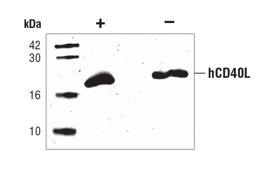 CD40 Ligand (CD40L), a member of the TNF superfamily of ligands, is expressed as either a membrane-bound or soluble homotrimer (1). Both membrane-bound and soluble forms of CD40L have biological activity (1,2). CD40L is expressed primarily on activated T cells; however, mast cells, basophils, and NK cells may also express CD40L (1). CD40L functions as an important T cell co-stimulatory molecule and enhances T-dependent B cell responses (1,2). CD40L binds CD40, which is a receptor expressed on B cells, dendritic cells, and macrophages (1). Binding of CD40L to CD40 leads to the recruitment of TRAF proteins (TRAFs 2,3,5, and 6) resulting in the activation of the JNK and NF-κB pathways (1,2).