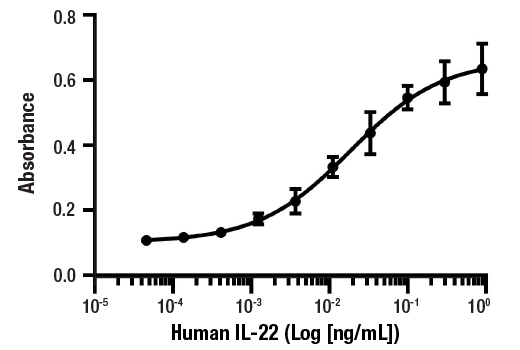 Activity The bioactivity of recombinant hIL-22 was determined by measuring the production of IL-10 from Colo 205 cells. The ED50 of each lot is less than or equal to 0.3 ng/mL.