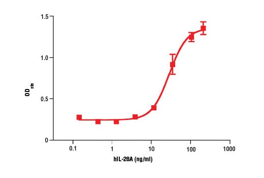 IL-28A is a member of the Interferon λ family of cytokines, which includes IL-29 and IL-28B (1). IL-28A is produced by a number of cell types and shares many functions with Type I Interferons (1-3). IL-28A exhibits anti-viral activities in vitro and in vivo (1,2). IL-28A directly inhibits tumor cell proliferation and promotes anti-tumor immune responses in vivo (1,3). The IL-28 receptor is a heterodimer of the IL28-Rα and IL10-RI (1). IL-28A activates Stat1, Stat3, and Stat5 (1). IL-28Rα expression is limited to a few cell types, including plasmacytoid DC and epithelial cells (1).