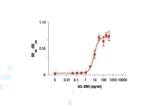 IL-28B is a member of the Interferon λ family of cytokines, which includes IL-29 and IL-28A (1). IL-28B is produced by a number of cell types and shares many functions with Type I Interferons (1-3). IL-28B exhibits anti-viral activities in vitro and in vivo (1,2). Investigators have found that IL-28B directly inhibits tumor cell proliferation and promotes anti-tumor immune responses in vivo (1,3). The IL-28 receptor is a heterodimer of the IL-28Rα and IL-10RI (1). IL-28B activates Stat1, Stat3, and Stat5 (1). IL-28Rα expression is limited to a few cell types, including plasmacytoid DC and epithelial cells (1).