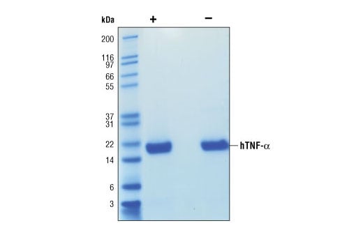 Recombinant human TNF-α (hTNF-α) Val77-Leu233 (Accession #HUMTNFAB) was produced in E. coli at Cell Signaling Technology.