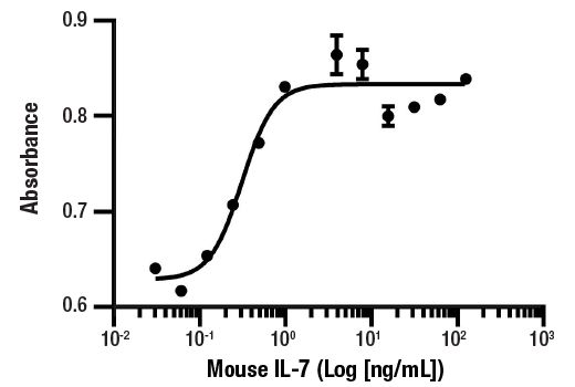 | Activity | The bioactivity of recombinant mIL-7 was determined in a 2E8 cell proliferation assay. The ED50 of each lot is less than or equal to 1 ng/mL. |