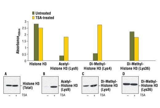 PathScan® Di-Methyl-Histone H3 (Lys36) Sandwich ELISA Kit #7868 detects endogenous levels of histone H3 when di-methylated at Lys36. As shown in Figure 1 using this Sandwich ELISA Kit #7868, a high level of di-methylation at Lys36 is detected on Histone H3 in NIH/3T3 cells. These levels are unchanged in response to TSA-treatment. The level of total histone H3 (modified and unmodified) remains unchanged as shown by Western analysis (Figure 1). Similar results are obtained when COS and Jurkat cells are treated with TSA (data not shown). Note: For this assay, it is recommended that lysates be thoroughly sonicated to ensure complete extraction of Histone H3 and an accurate absorbance reading. This kit detects proteins from the indicated species, as determined through in-house testing, but may also detect homologous proteins from other species.
