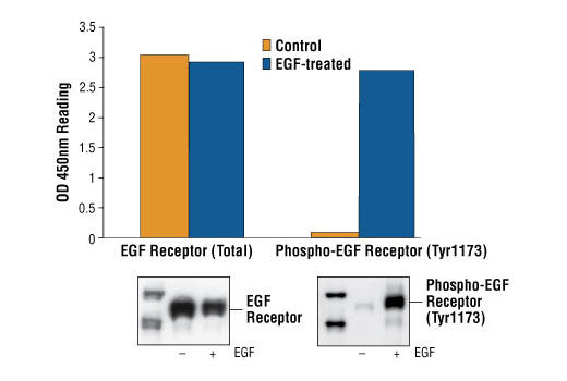 CST's PathScan® Phospho-EGF Receptor (Tyr1173) Sandwich ELISA Kit is a solid phase sandwich enzyme-linked immunosorbent assay (ELISA) that detects endogenous levels of phospho-EGF Receptor (Tyr1173) protein. An EGF Receptor Mouse mAb has been coated onto the microwells. After incubation with cell lysates, both phospho- and nonphospho-EGF Receptor proteins are captured by the coated antibody. Following extensive washing, Phospho-EGF Receptor (Tyr1173) Rabbit mAb is added to detect the captured phospho-EGF Receptor protein. Anti-rabbit IgG, HRP-linked Antibody #7074* is then used to recognize the bound detection antibody. HRP substrate, TMB, is added to develop color. The magnitude of optical density for this developed color is proportional to the quantity of phospho-EGF Receptor (Tyr1173) protein.