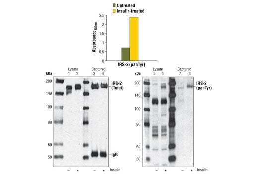 PathScan® Phospho-IRS-2 (panTyr) Sandwich ELISA Kit #7860 detects IRS-2 when tyrosine phosphorylated. As shown in Figure 1, a significant induction of IRS-2 tyrosine phosphorylation can be detected in CHO (IR/4PS) cells following treatment with insulin using this Sandwich ELISA Kit #7860. The level of total IRS-2 (phospho and nonphospho) remains unchanged as shown by Western analysis. This kit also detects tyrosine phosphorylated IRS-2 in insulin treated 3T3-L1 adipocytes (data not shown). This kit detects proteins from the indicated species, as determined through in-house testing, but may also detect homologous proteins from other species.