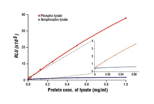 The PathScan® Phospho-Ret (panTyr) Chemiluminescent Sandwich ELISA Kit is a solid phase sandwich enzyme-linked immunosorbent assay (ELISA) that detects endogenous levels of tyrosine-phosphorylated Ret protein with a chemiluminescent readout. Chemiluminescent ELISAs often have a wider dynamic range and higher sensitivity than conventional chromogenic detection. This chemiluminescent ELISA, which is offered in low volume microplates, shows increased signal and sensitivity while using a smaller sample size. A Ret Rabbit mAb has been coated onto the microwells. After incubation with cell lysates, Ret protein (phospho and nonphospho) is captured by the coated antibody. Following extensive washing, a Phospho-Tyrosine Mouse Detection mAb is added to detect captured tyrosine-phosphorylated Ret protein. Anti-mouse IgG, HRP-linked Antibody is then used to recognize the bound detection antibody. Chemiluminescent reagent is added for signal development. The magnitude of light emission, measured in relative light units (RLU), is proportional to the quantity of tyrosine-phosphorylated Ret protein.