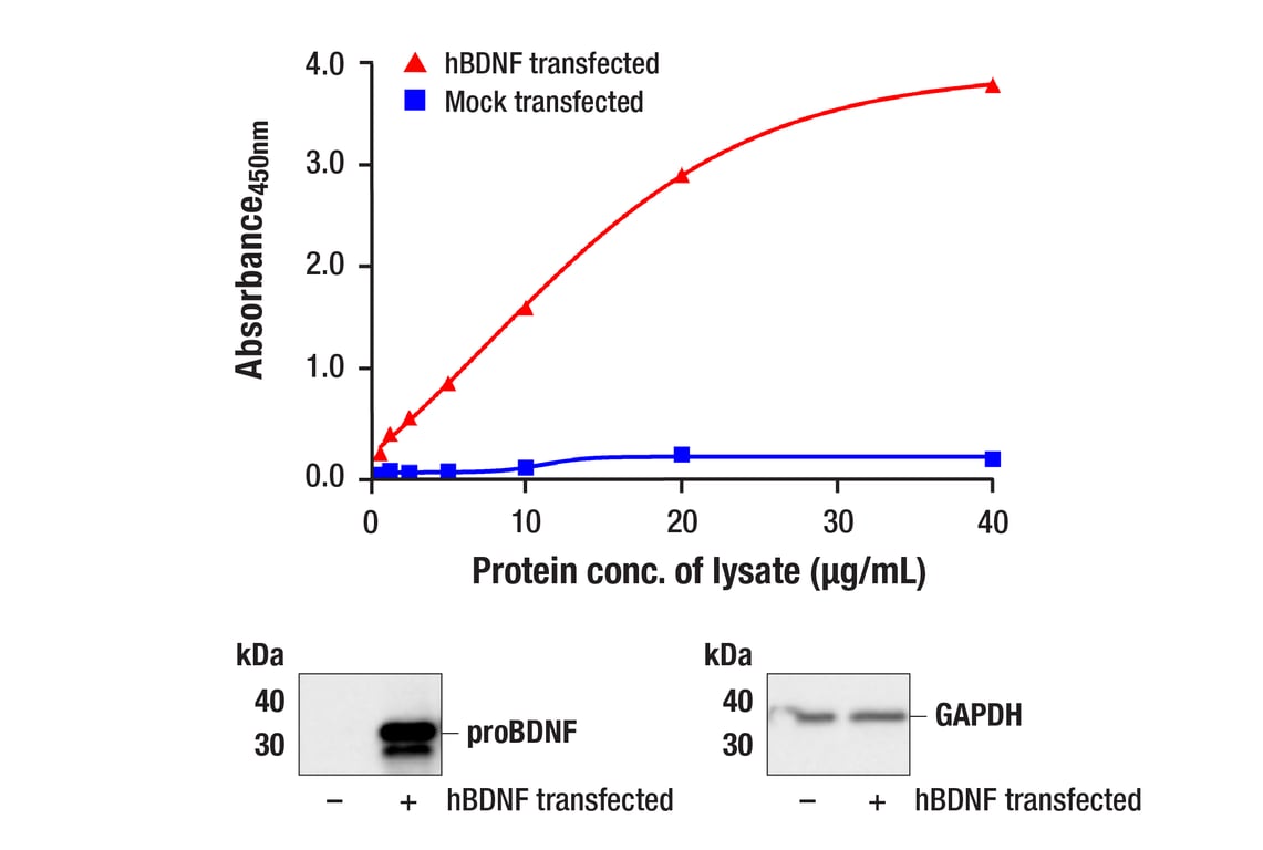 The PathScan® RP BDNF Sandwich ELISA Kit detects both full-length BDNF protein and the mature form of BDNF. This kit sensitivity is shown in Figure 1. This kit detects proteins from the indicated species, as determined through in-house testing, but may also detect homologous proteins from other species.