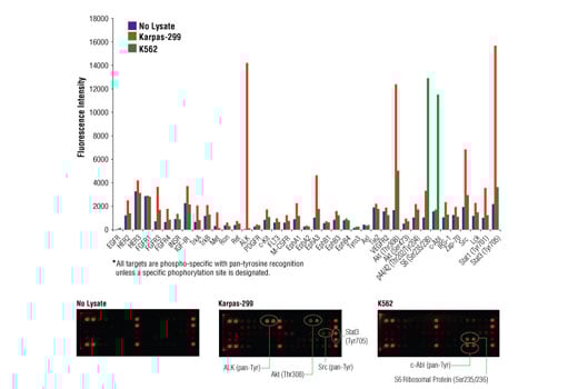PathScan® RTK Signaling Antibody Array Kit (Fluorescent Readout) detects the indicated RTKs and signaling nodes only when phosphorylated at tyrosine or specified residues (see Array Target Map). No significant crossreactivity has been observed between targets, with the exception of some crossreactivity of the FLT3 antibody with phosphorylated EphB3. In addition, Stat1 (Tyr701) and Stat3 (Tyr705) may be detected when phosphorylated at other tyrosine sites within the proteins. This kit is optimized for cell lysates diluted to a total protein concentration between 0.2 and 1 mg/ml (see Figure 4). All capture antibodies have been validated for human targets. Although this kit has not been tested with mouse lysates, it is expected than many capture antibodies will crossreact in murine systems.