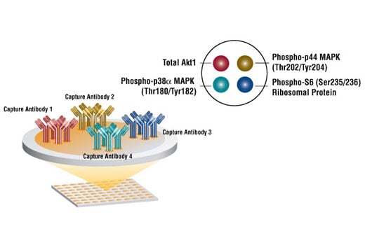 Briefly, 4 capture antibodies with distinct target specificity have been spotted onto the bottom of each well of a microwell plate. After incubation with cell lysates, the spotted antibodies capture the target proteins. Following extensive washing, a mixture of detection antibodies is added to detect the captured target proteins. An HRP-linked secondary solution is then used to recognize the bound detection antibodies. Chemiluminescent HRP substrate is used to produce luminescent signal.