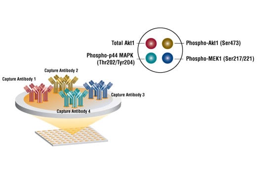 Briefly, 4 capture antibodies with distinct target specificity have been spotted onto the bottom of each well of a microwell plate. After incubation with cell lysates, the spotted antibodies capture the target proteins. Following extensive washing, a mixture of detection antibodies is added to detect the captured target proteins. An HRP-linked secondary solution is then used to recognize the bound detection antibodies. Chemiluminescent HRP substrate is used to produce luminescent signal.