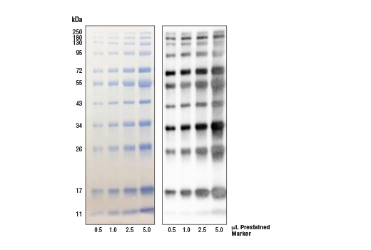 Please note, when using #59329 Blue Prestained Protein Marker, Broad Range (11-250 kDa) with #46387 Anti-Blue (2D2F11) Mouse Monoclonal Antibody (HRP Conjugate), it is recommended to load between 0.5 μl-2.5 μl of #59329 to better visualize the separation of proteins while minimizing excess background due to an overabundance of protein.