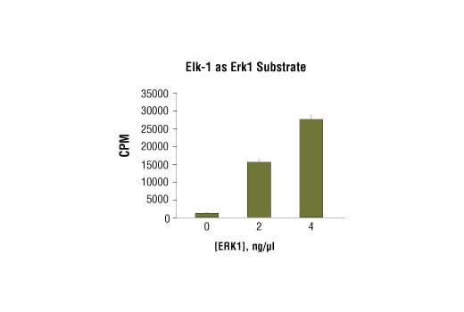 | Activity | Elk 1 Fusion Protein at a concentration of 2 µg/20 µ| reaction was phosphorylated using p42 MAP kinase (Erk1) in an in vitro kinase assay with 1X Kinase Buffer #9802 and 200 µM ATP #9804. After a 30-minute assay at 30°, phosphorylation was detected by Western blot with Phospho-Elk-1 (Ser383) Antibody #9181. |