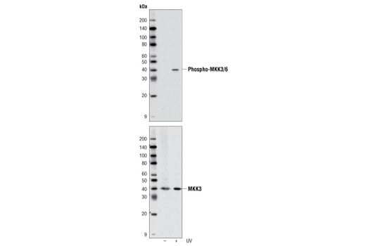 Boil for 3 minutes prior to use. Load 20 µl of phosphorylated and nonphosphorylated MKK3/MKK6 Control Cell Extracts per lane.
