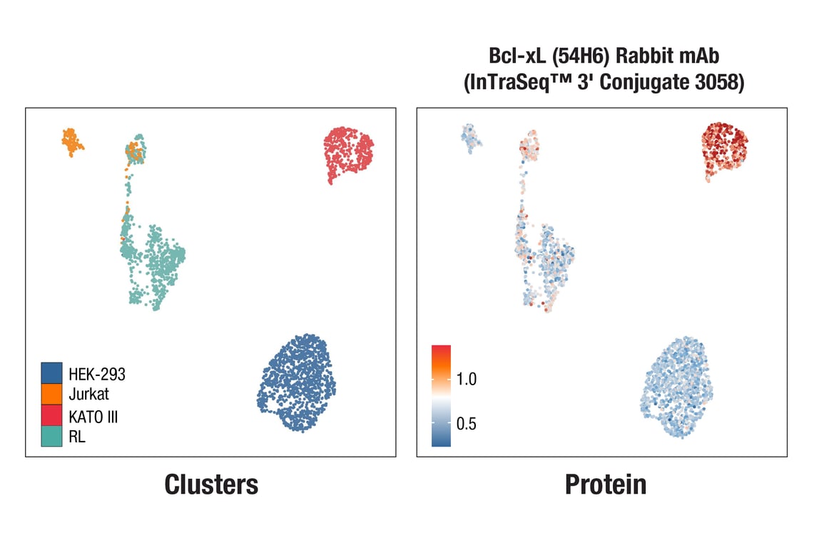 Bcl-xL (54H6) Rabbit Monoclonal Antibody (InTraSeq™ 3' Conjugate 3058) detects endogenous levels of total Bcl-xL protein. This antibody conjugate does not cross-react with other Bcl-2 family members.