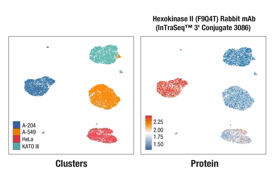 Hexokinase II (F9Q4T) Rabbit mAb (InTraSeq™ 3' Conjugate 3086) recognizes endogenous levels of total hexokinase II protein. This antibody does not cross-react with hexokinase I protein.