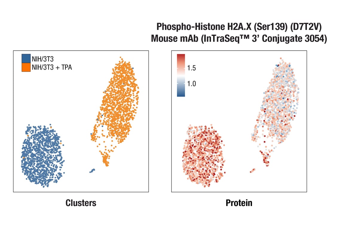 Phospho-Histone H2A.X (Ser139) (D7T2V) Mouse Monoclonal Antibody (InTraSeq™ 3' Conjugate 3054) recognizes endogenous levels of Histone H2A.X protein only when phosphorylated at Ser139.