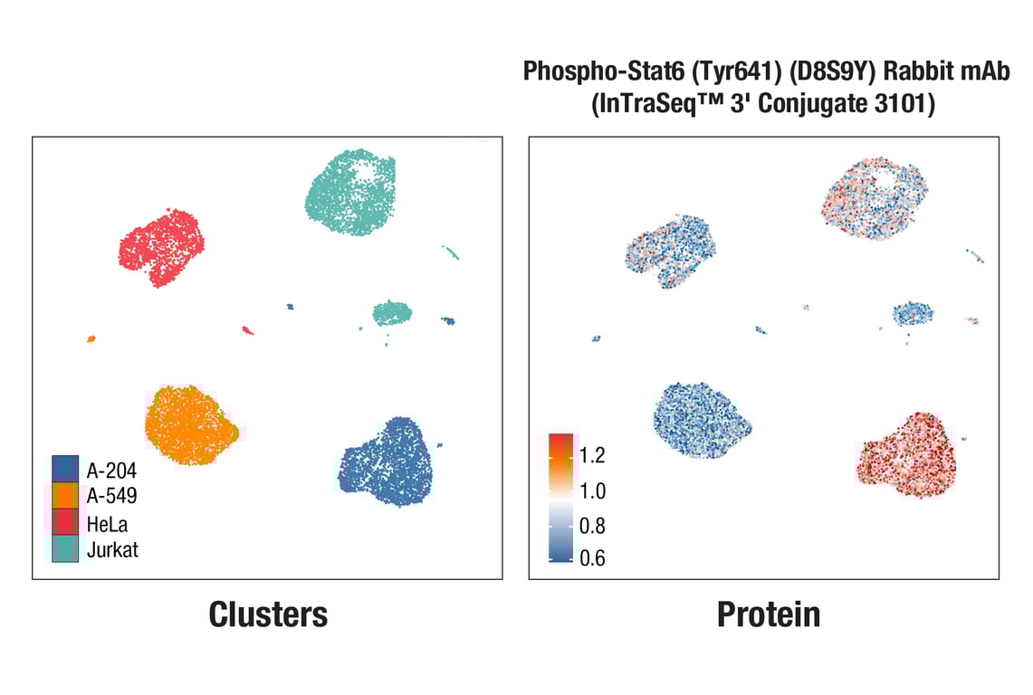 Phospho-Stat6 (Tyr641) (D8S9Y) Rabbit mAb (InTraSeq™ 3' Conjugate 3101) recognizes endogenous levels of Stat6 protein only when phosphorylated at Tyr641. Weak cross-reactivity with other tyrosine-phosphorylated proteins has been observed in some cell lines.