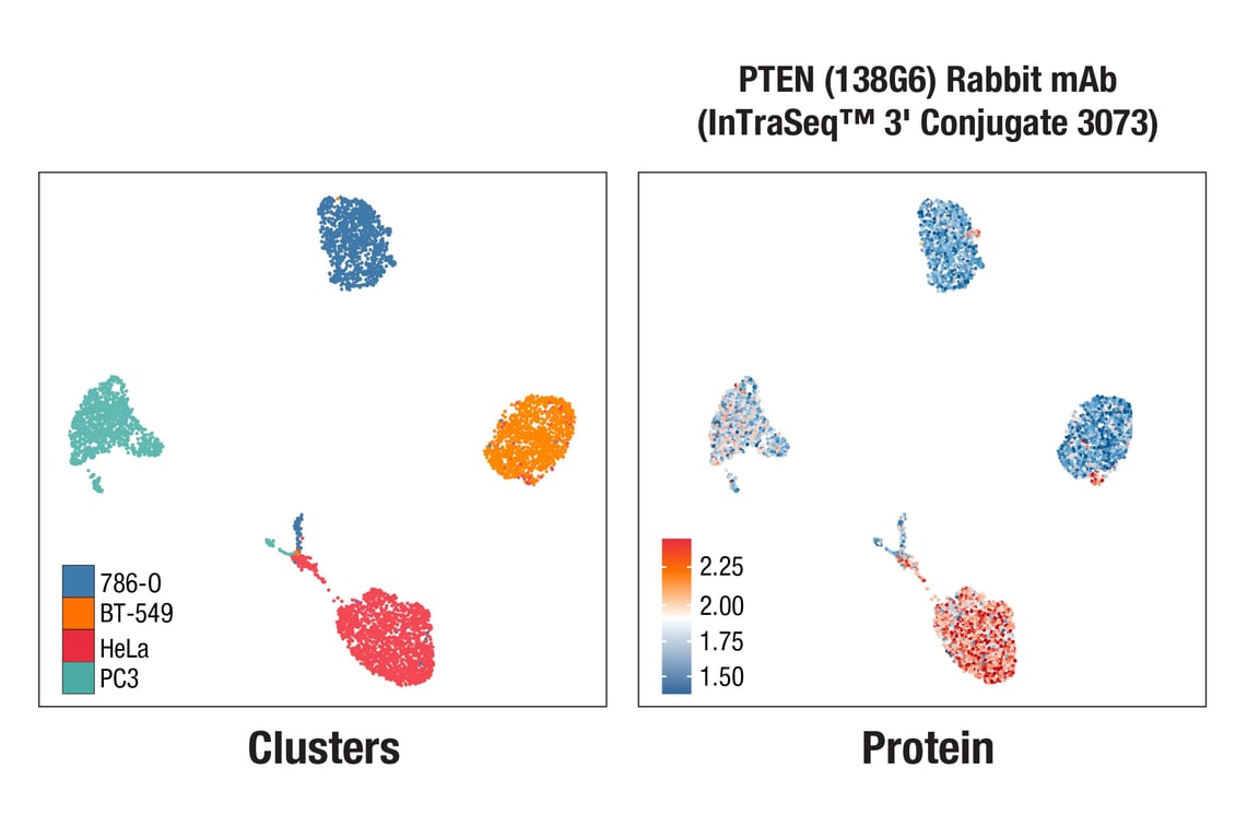 PTEN (138G6) Rabbit Monoclonal Antibody (InTraSeq™ 3' Conjugate 3073) detects endogenous levels of total PTEN protein.