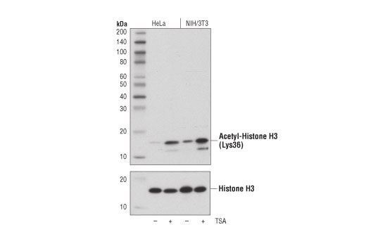 Acetyl-Histone H3 (Lys36) (D9T5Q) Rabbit Monoclonal Antibody recognizes endogenous levels of histone H3 protein only when acetylated at Lys36. This antibody does not cross react with other known acetylated lysine residues on histones H3, H4, H2A and H2B.