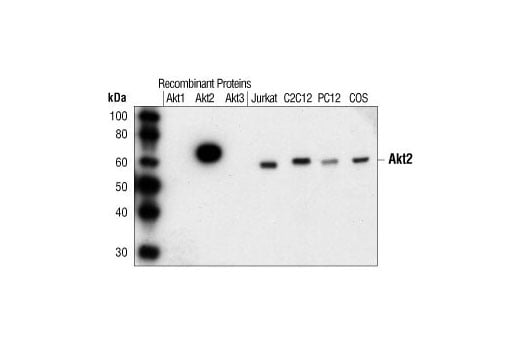 Akt2 (5B5) Rabbit Monoclonal Antibody preferentially binds to non-phosphorylated endogenous levels of Akt2. This antibody does not cross-react with recombinant Akt1 or Akt3.