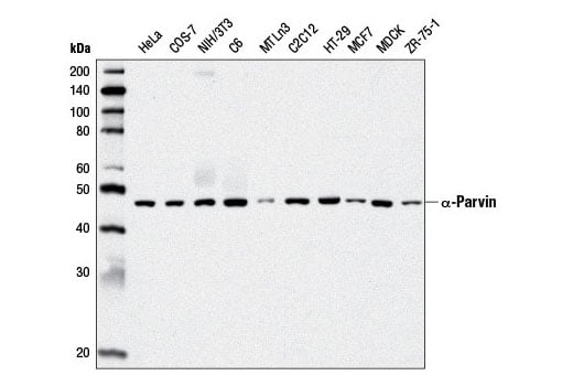 alpha-Parvin (D7F9) Rabbit Monoclonal Antibody recognizes endogenous levels of total α-parvin protein.