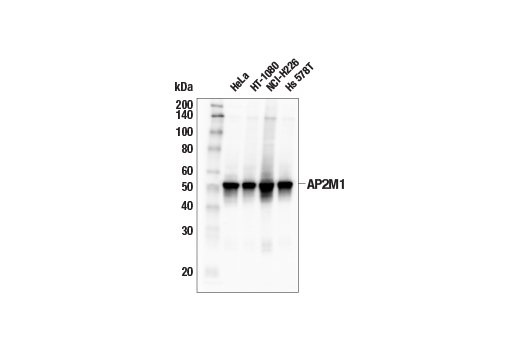 AP2M1 (E5X6F) Rabbit Monoclonal Antibody recognizes endogenous levels of total AP2M1 protein.