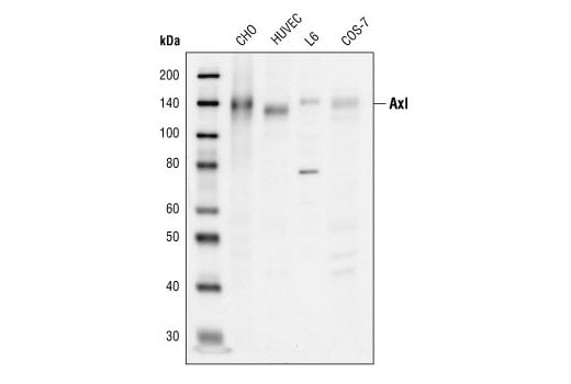 The antigen sequence used to produce this antibody shares 100% sequence homology with the species listed here, but reactivity has not been tested or confirmed to work by CST. Use of this product with these species is not covered under our Product Performance Guarantee.