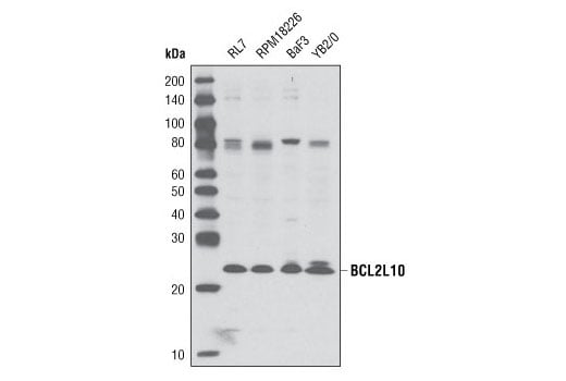 Bcl-2-like 10 (BCL2L10), known as Diva or Boo in mouse (6,7) and Bcl-B in human (8), is a Bcl-2 family member with some unique properties. Expression of the mouse mRNA was detected in multiple embryonic tissues but restricted to adult ovary and testis (6,7); human Bcl-B appears to be more widely expressed (8). BCL2L10 contains BH1, 2, and 4 domains as well as a putative carboxy-terminal transmembrane domain. While some studies report the presence of a pro-apoptotic BH3 domain in BCL2L10, conflicting reports indicate an incomplete or absent BH3 domain (7-9). Similarly, some studies indicate that BCL2L10 induces apoptosis (6,9) while other data implies a role in suppressing cell death (7,8,10). BCL2L10 may function by differentially binding other Bcl-2 family members and through interaction with the apoptosome protein Apaf-1 (6,7). Despite its restricted expression in mice, Diva knockouts were fertile and exhibit no obvious developmental defects (11).