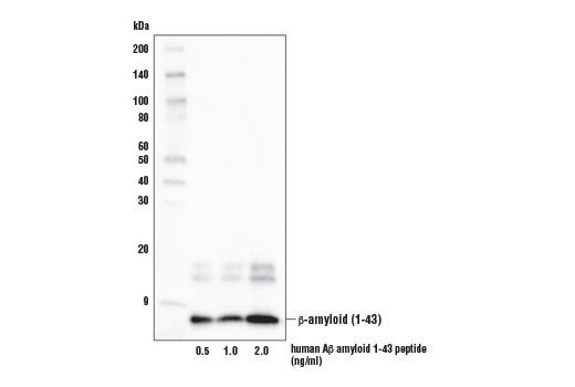 beta-Amyloid (1-43) (E8C2D) Rabbit Monoclonal Antibody recognizes endogenous levels of total human Aβ-43 protein. This product detects transgenically expressed human APP in mouse models. This antibody weakly cross-reacts with human Aβ-42 protein.