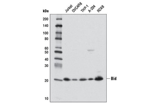 Bid (3C5) Mouse Monoclonal Antibody recognizes endogenous levels of total Bid protein. This antibody does not cross-react with endogenous levels of tBid during apoptosis.