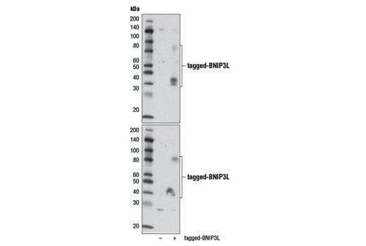 BCL2/Adenovirus E1B 19 kDa protein-interacting protein 3-like (BNIP3L) (1), also termed BNIP3α (2), B5 (3), and Nix (4), is a member of the Bcl-2 family of apoptotic regulators with highest homology to BNIP3. BNIP3L can bind BNIP3, Bcl-xL, and Bcl-2 (1-5). BNIP3L forms homodimers that withstand denaturing by SDS and reducing conditions (5). BNIP3L is a mitochondrial protein and knockout studies suggest that BNIP3L regulates autophagic clearance of damaged mitochondria during erythroid maturation via mitochondrial autophagy (6,7). It has been shown that the expression of BNIP3L is up-regulated during terminal erythroid differentiation (6-8), as well as in tumor cell lines during hypoxia (9-11). BNIP3L directly regulates the elimination of mitochondria through its ability to bind to and recruit important components of the autophagic machinery, including LC3/Atg8 and GABARAP proteins, via its amino-terminal LC3-interacting region (LIR) (12). BNIP3L may also indirectly activate phagophore formation either via the recruitment of autophagy proteins or by binding Bcl-xL, which in turn releases Beclin-1 (13). BNIP3L/Nix also plays a pivotal role in Parkin-mediated mitochondrial autophagy via its ability to mediate the mitochondrial translocation of Parkin (14). Activated BNIP3L can promote the opening of mitochondrial permeability transition pores resulting in mitochondrial depolarization, generation of reactive oxygen species, and induction of necrosis. Due to its involvement in cell death and autophagy, research scientists have implicated BNIP3L in heart disease and cancer (13).