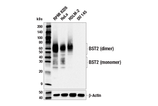 BST2 (E4N3W) Rabbit Monoclonal Antibody (BSA and Azide Free) recognizes endogenous levels of total BST2 protein. This clone shows a preference for the BST2 dimer by western blot.