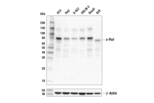 c-Rel contains an amino-terminal DNA-binding domain referred to as the REL homology domain (RHD) and carboxy-terminal transactivation domains. The c-Rel protein is typically inhibited in unstimulated cells by IκBα and IκBβ. c-Rel expression is highest in hematopoietic cells with extensive research studies demonstrating its role in immune cell function and pathogenesis of disease (12,13).