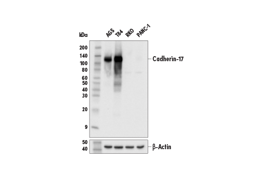 Cadherin-17 (E5B1Y) Rabbit Monoclonal Antibody recognizes endogenous levels of total cadherin-17 protein.