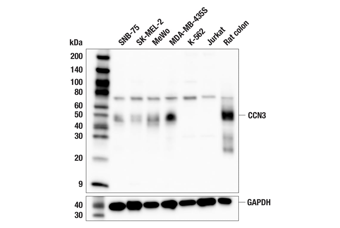 CCN3 (F1I3E) Rabbit Monoclonal Antibody recognizes endogenous levels of total CCN3 protein. This antibody detects a 75 kDa protein of unknown identity in some cell lines.