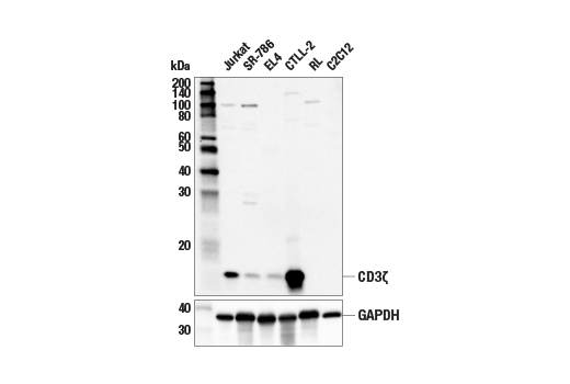The CD3ζ invariant chain is a type-I transmembrane protein that exists in the TCR signaling complex as a disulfide-linked homodimer (6). The cytoplasmic tail of each CD3ζ monomer contains three distinct ITAM motifs, each containing two tyrosine residues. Phosphorylation of CD3ζ ITAM tyrosine residues, including Y142, is driven by recruitment of the Lck and Fyn tyrosine kinases to the TCR (7). Lck/Fyn-mediated ITAM phosphorylation creates docking sites that promote the SH2 domain-dependent recruitment and activation of Zap-70 (8-10), which drives amplification of signaling events downstream of the TCR that facilitate T cell activation (10). Phosphorylation of a pool of p16 CD3ζ leads to the generation of p21 and p23 species, which differ in the degree of ITAM phosphorylation. It has been proposed that the ratio of p21/p23 contributes to regulating the amplitude of T cell activation (11). CD3ζ plays an important role in the assembly and surface expression of the TCR complex. Indeed, research studies have demonstrated that CD3ζ is degraded in response to Ag-dependent TCR stimulation as a mechanism to tightly control T cell activation (12).