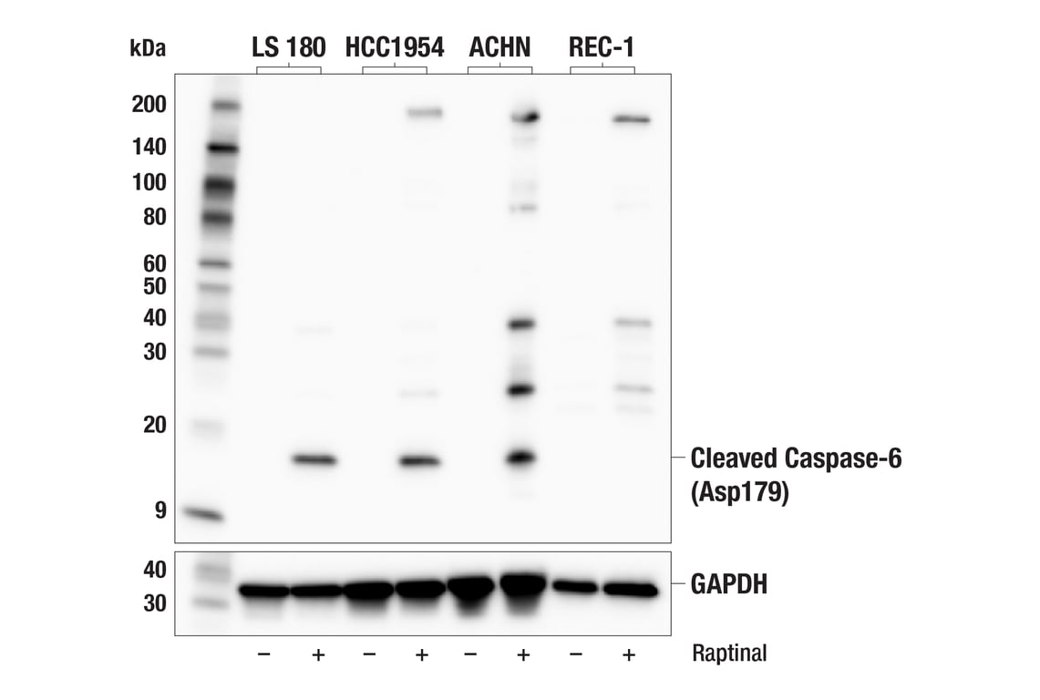Cleaved Caspase-6 (Asp179) (E8L9T) Rabbit Monoclonal Antibody recognizes endogenous levels of caspase-6 protein only when cleaved at Asp179. Non-specific bands were observed upon apoptosis at 25, 40, and 200 kDa in some cell lines.