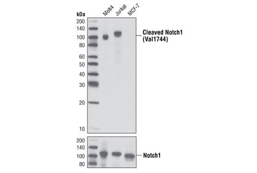 Cleaved Notch1 (Val1744) (D3B8) Rabbit Monoclonal Antibody (BSA and Azide Free) detects endogenous levels of the Notch1 intracellular domain (NICD) only when released by cleavage between Gly1753 and Val1754 (equivalent to Gly1743/Val1744 of murine notch1). This antibody does not recognize full-length Notch1 or Notch1 cleaved at other positions. The size of the NICD varies among cell lines due to mutations in the Notch1 C-terminus (6).