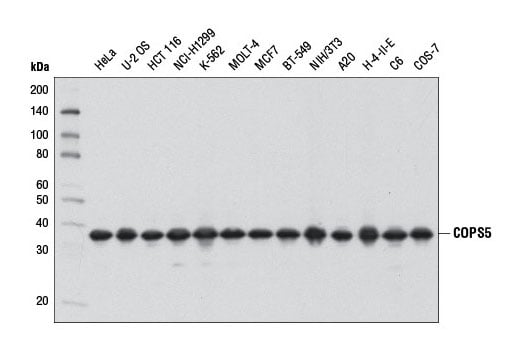 COPS5 (D15G6) Rabbit Monoclonal Antibody recognizes endogenous levels of total COPS5 protein. This antibody does not cross-react with PSMD14/POH1.