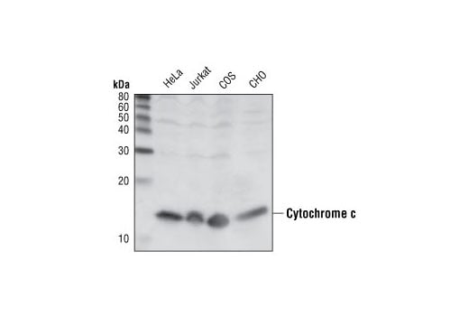Cytochrome c is a well conserved electron-transport protein and is part of the respiratory chain localized to mitochondrial intermembrane space (1). Upon apoptotic stimulation, cytochrome c released from mitochondria associates with procaspase-9 (47 kDa)/Apaf 1. This complex processes caspase-9 from inactive proenzyme to its active form (2). This event further triggers caspase-3 activation and eventually leads to apoptosis (3).