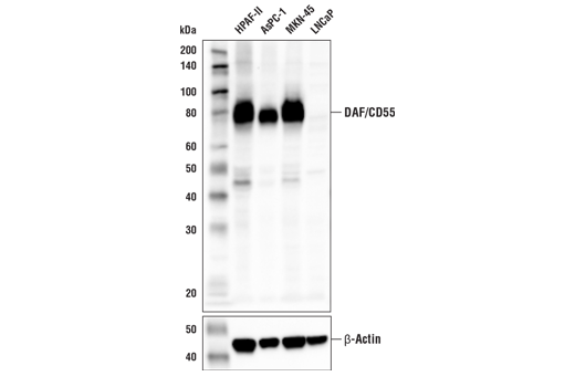DAF/CD55 (E7G2U) Rabbit Monoclonal Antibody recognizes endogenous levels of total DAF/CD55 protein.