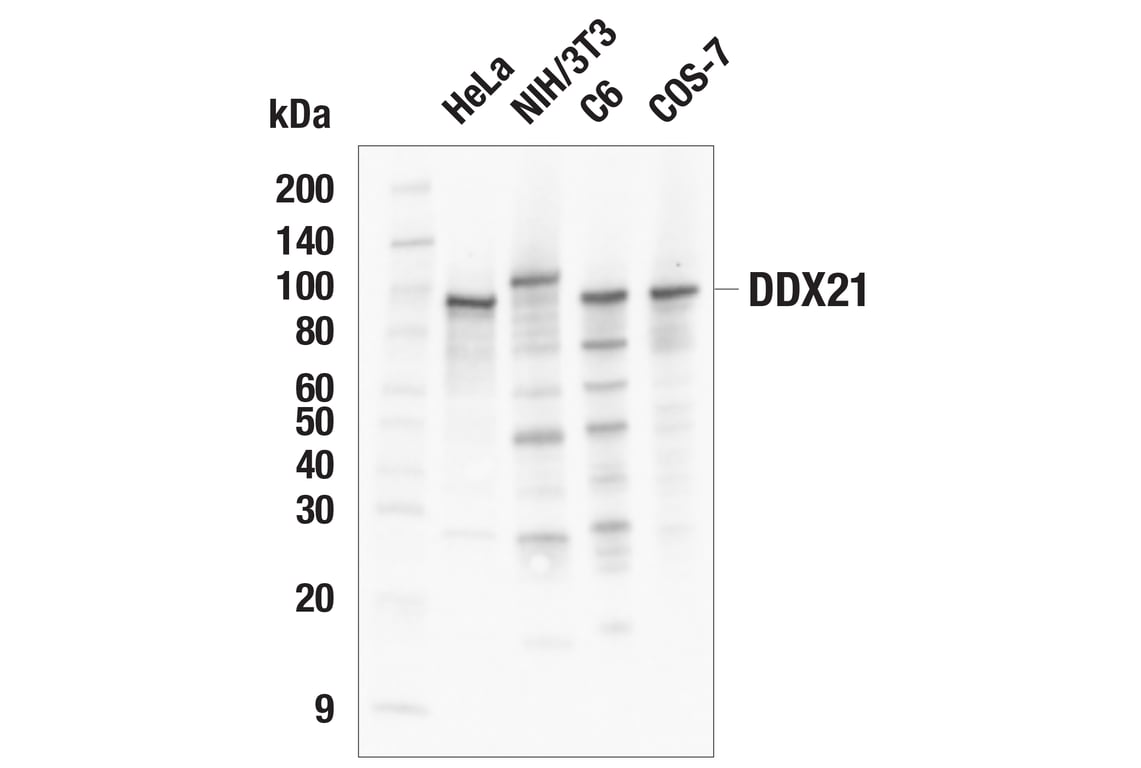 DDX21 (E9O2Q) Rabbit Monoclonal Antibody recognizes endogenous levels of total DDX21 protein.