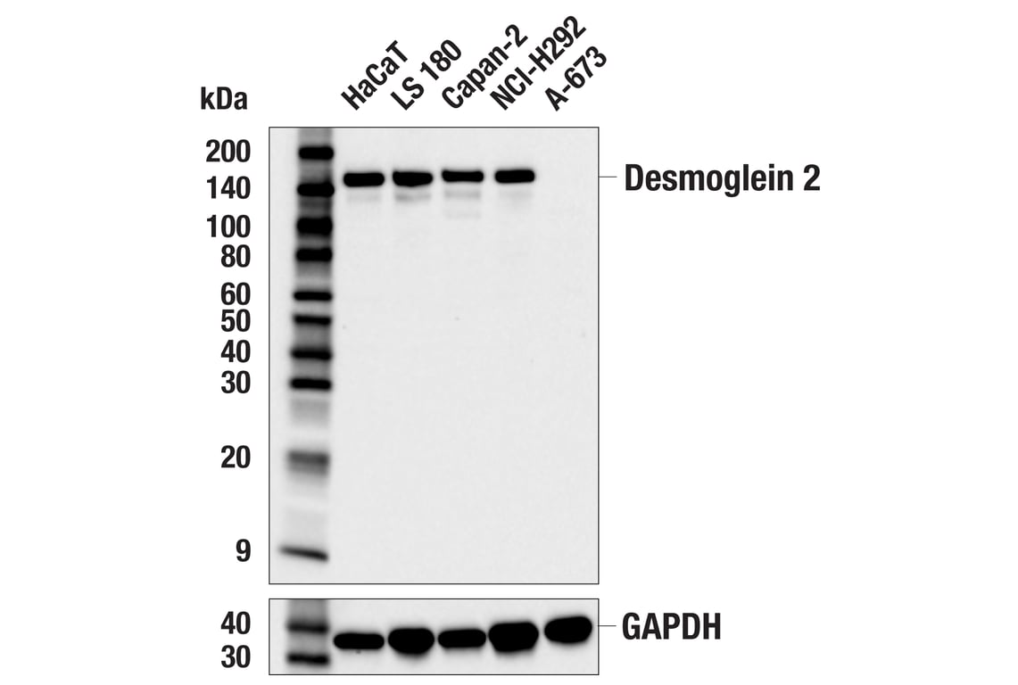 Desmoglein 2 (8E5) Mouse Monoclonal Antibody recognizes endogenous levels of total desmoglein 2 protein. This antibody does not cross-react with desmoglein 1 or desmoglein 3 proteins.