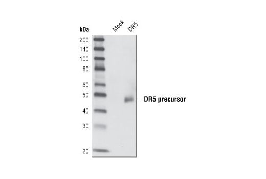 DR5 is a receptor for TNF-related apoptosis inducing ligand (TRAIL), which has been been shown to induce apoptosis in variety of cell types and has been targeted for cancer therapy (1-5). Structurally, DR5 contains an amino-terminal leader cleavage site followed by an extracellular region containing two cysteine-rich repeats, then a central transmembrane domain and a carboxy-terminal death domain. DR5 is expressed in a wide variety of tissues and is transcriptional target for p53 (6-8). It induces apoptosis through a FADD-dependent pathway. Deletion of DR5 leads to resistance in TRAIL-mediated apoptosis as well as an abrogated response to DNA-damaging stimuli (9).