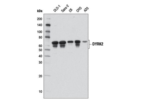 DYRK2 (D9A3K) Rabbit Monoclonal Antibody recognizes endogenous levels of total DYRK2 protein. This antibody recognizes both known isoforms, 66 and 60 kDa, of DYRK2.