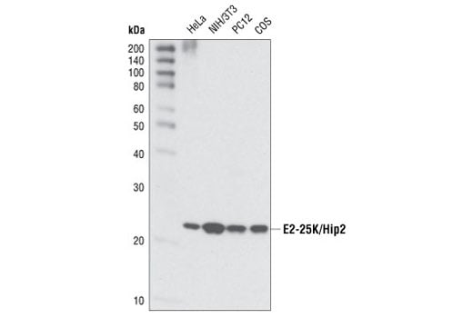 E2-25K (Hip2) is a member of the E2 protein family that catalyzes multiubiquitin chain synthesis via Lys48 of ubiquitin (2). E2-25K is reportedly involved in Alzheimer's disease, Huntington's disease and antigen processing through its interaction with amyloid-β, huntingtin, and MHC-heavy chain proteins (3-5). Lys14 of E2-25K can be modified by SUMOylation, with this modification resulting in inhibited E2 activity (6).