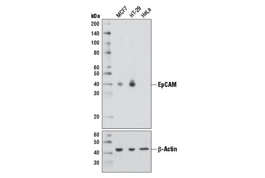 EpCAM (D1B3) Rabbit Monoclonal Antibody (BSA and Azide Free) recognizes endogenous levels of total EpCAM protein.